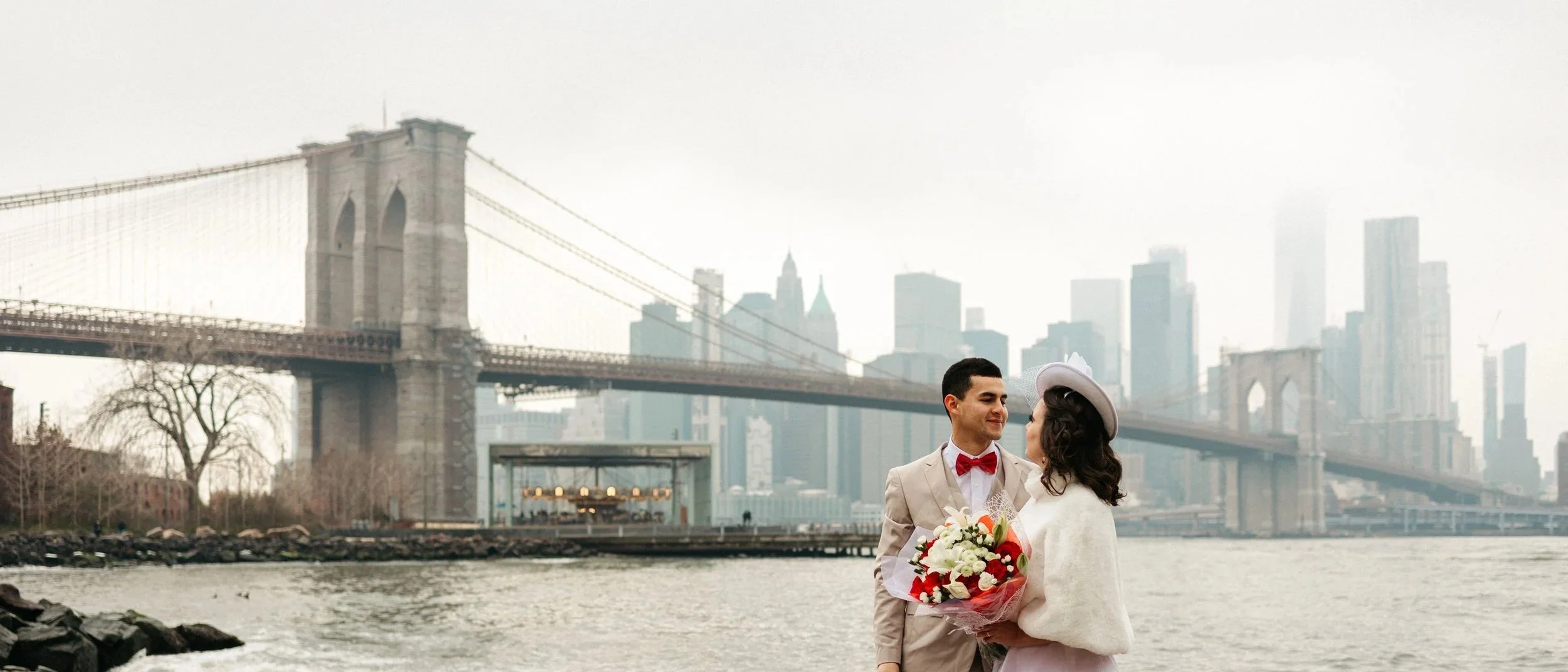 With the views of East River and the Manhattan skyline, DUMBO remains one of the most recognizable locations for elopement and wedding photography in New York — known for its cobblestone streets, dramatic bridge perspective, and classic city atmosphere.