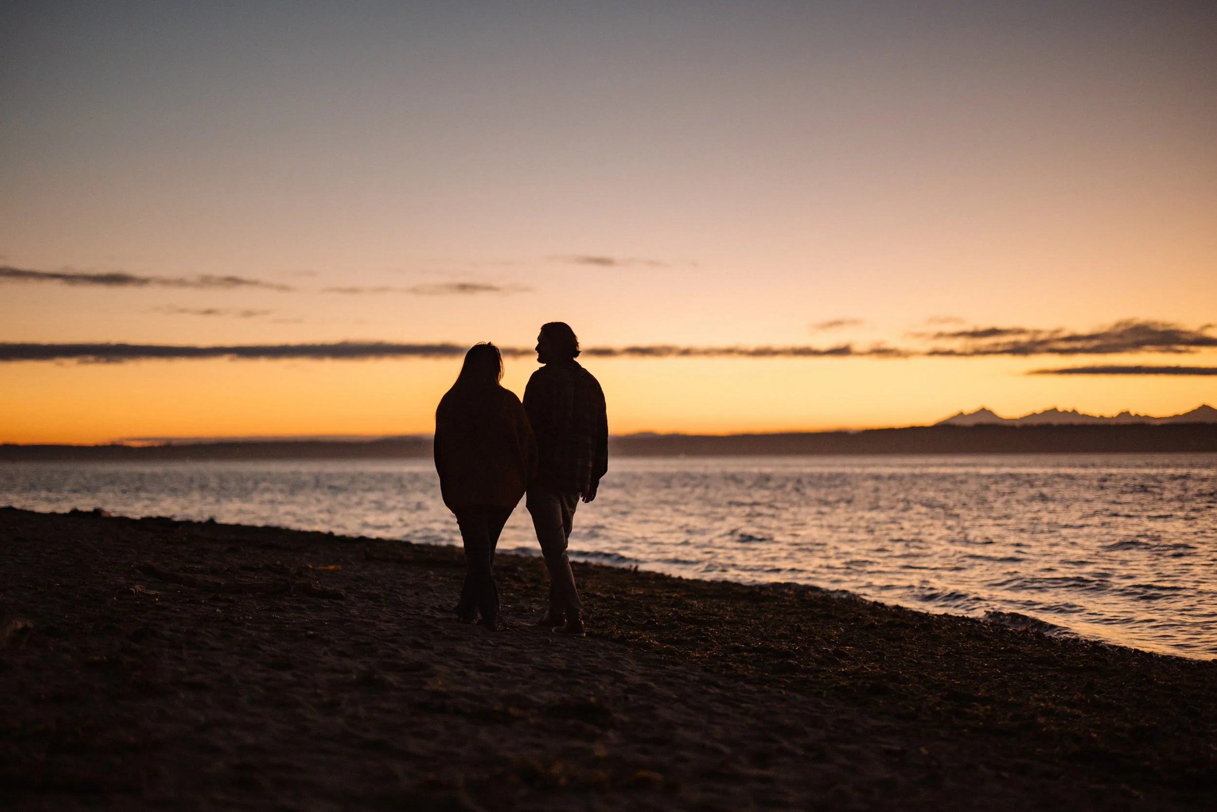 This Golden Gardens engagement and proposal celebration session in Seattle, with soft sunset light and calm shoreline.